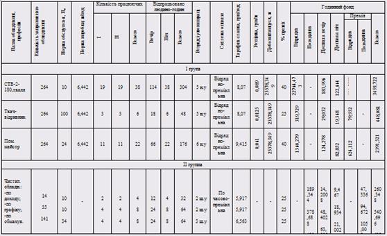 | Машини по переходам | Тип чи система машин | Назва продукту, який виходить | Швидкість випускних органів | Теоретична продуктивність, кг/год, м/год | КПВ | Планова продуктивність, кг/год, м/год | КРО | |