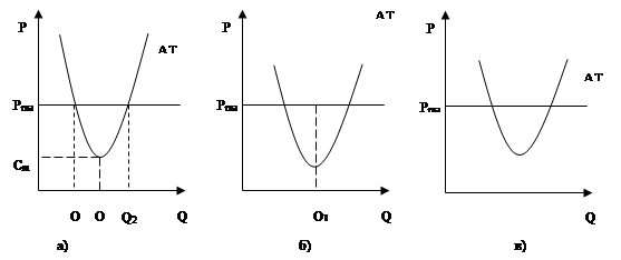 В ситуации а) производство будет прибыльным, если товар будет производиться в количестве Q1 - Q2 , однако наибольшую прибыль предприниматель получит при производстве Q0 единиц продукции. В ситуации б) только при объеме выпуска Q1 предприниматель может производить продукцию без убытков, но и прибыли он не получит, потому что издержки производства совпадут с рыночной ценой товара. А в ситуации в) производство вообще не рентабельно: при любых объемах производства издержки будут превышать цену товара.