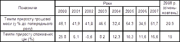 Приріст грошової маси та інфляція в економіці України у 2000-2008 рр.