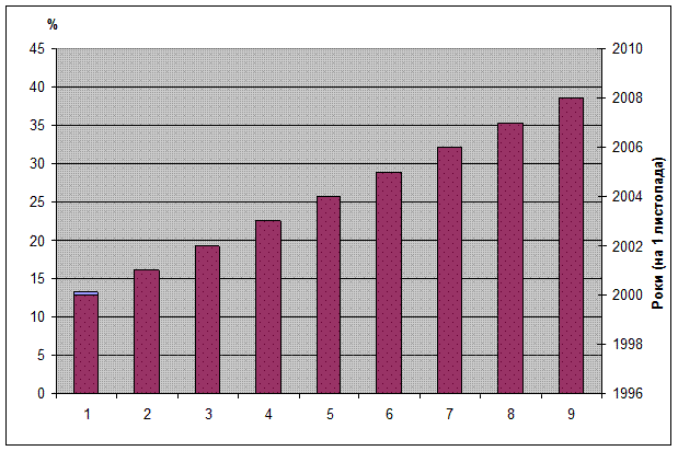 Рис. 1. Частка іноземного капіталу в статутному капіталі банківської системи України.