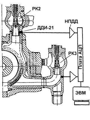 Выбор типа датчика пульсаций давления осуществлялся из условий возможности его применения при высоких давлениях перегретого водяного пара (р0=13 МПа), а также при сложных температурных состояниях рабочей среды и корпусных элементов турбины (t=550 0С). Частотная характеристика датчика должна соответствовать измеряемым колебаниям давления с частотами до нескольких килогерц. Были установлены требования к статической точности, чувствительности к изменению внешних условий эксплуатации датчика, виду и значению выходного сигнала. В результате был выбран индуктивный тип датчика модификации ДДИ-21 в комплекте с высокочастотным нормирующим преобразователем НПДД (см. рис.1). Для сбора информации в персональном компьютере использовалась плата АЦП серии L-1250.