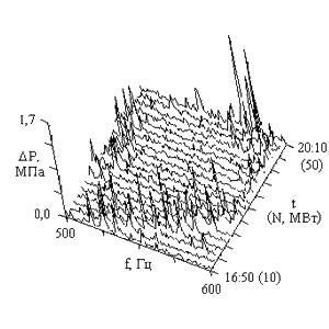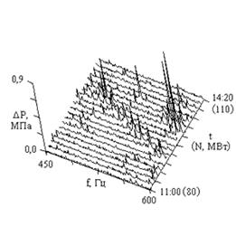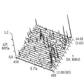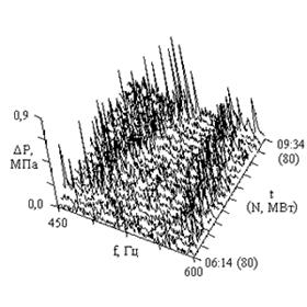 На данной спектрограмме по вертикальной оси отложен диапазон зафиксированных значений пульсаций давления (от 0 до 1,2 МПа с интервалом 0,3 МПА), по горизонтальной оси - диапазон частот (от 450 до 600 Гц с интервалом 37,5 Гц), а по третьей оси соответствующий диапазон времени регистрации. Спектрограммы представлены с градуировкой интервала времени dt=20 мин, т.е. в одном отрезке шкалы показаны два спектра пульсаций давления. Видно весьма существенное изменение не только амплитуд отдельных гармоник, но и частот этих гармоник. Так, например, в 11:10 (вторая запись по времени) наибольшей является гармоника с частотой около 590 Гц и амплитудой пульсаций на уровне 0,6 МПа. В следующей записи по времени частота уменьшается до 580 Гц, а амплитуда увеличивается до 1,1…1,2 МПа. Вследствие того, что нижняя сопловая коробка обслуживается регулирующим клапаном РК3, который закрыт в данном режиме, наличие пульсационных характеристик в спектрограмме нижнего датчика говорит об аэродинамической связи сопловой коробки и регулирующей ступени. При этом обнаружена общность, как в частотном спектре, так и в уровне амплитуд пульсаций для рассматриваемых элементов ЦВД.