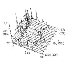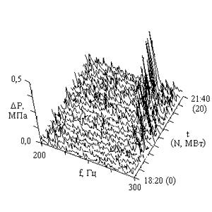 Главной особенностью переходных режимов при изменении нагрузки энергоблока является тренд частот пульсаций давления. Например, с ростом мощности блока от 80 до 175 МВт частота пульсаций плавно увеличивается от 200 до 275 Гц, а с дальнейшим ростом мощности до 200 МВт частота сокращается до 225 Гц.