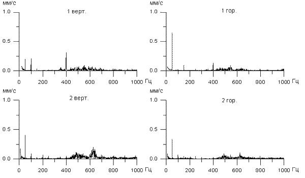 Рис. 1.5. Спектральные характеристики вибрации опор N 1 и 2 РВД при нагрузке Nэ = 82 МВт.