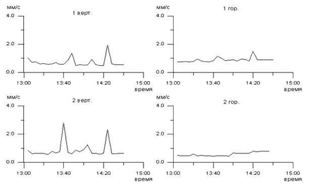 Рис. 1.6. Характер изменения суммарной виброскорости опор N 1 и 2 РВД в вертикальном и поперечном направлениях при росте нагрузки энергоблока от 80 до 167 МВт.