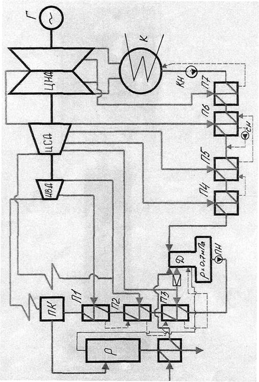 В принципиальной тепловой схеме блока несколько одинаковых агрегатов и установок изображаются одним агрегатом или установкой; резервное оборудование в эту схему не вьслючают; в ней показывают лишь принципиальные связи (коммуникации) между оборудованием, необходимые для осуществления основного технологического процесса.