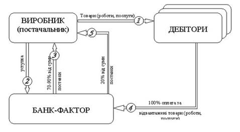 Комплекс послуг, що надаються банком при факторингу, включає фінансування постачань товарів, страхування кредитних рисок, облік стану дебіторської заборгованості і регулярне надання відповідних звітів клієнтові, контроль за своєчасністю оплати і роботу з дебіторами. Схема факторингових операцій виглядає таким чином. Підприємство поставляє товар на умовах відстрочення платежу, при цьому воно поступається правом вимоги довга по постачанню банку. Банк виплачує постачальникові до 90% суми товару відразу після постачання, а що залишилися 10%, з яких віднімається комісія за наданий комплекс послуг, - після оплати товару покупцем.
