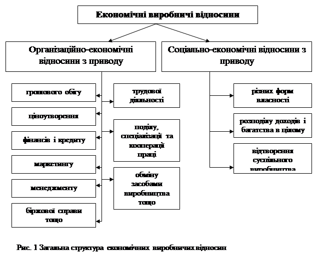 · організаційно-економічні відносини безпосередньо пов'язані з продуктивними силами. Вони виникають з приводу трудової діяльності, кооперації праці, обміну засобами виробництва тощо. В цілому ці відносини втілені в господарській системі організації та управління економікою на різних рівнях. Конкретні організаційно-економічні відносини відображені у господарських системах окремих галузей суспільного виробництва - економіка промисловості, сільського господарства, торгівлі, охорони здоров'я тощо. Їхню специфіку вивчають конкретні економічні науки. До загальних організаційно-економічних відносин належать форми і методи господарювання, характерні для всіх галузей економіки;
