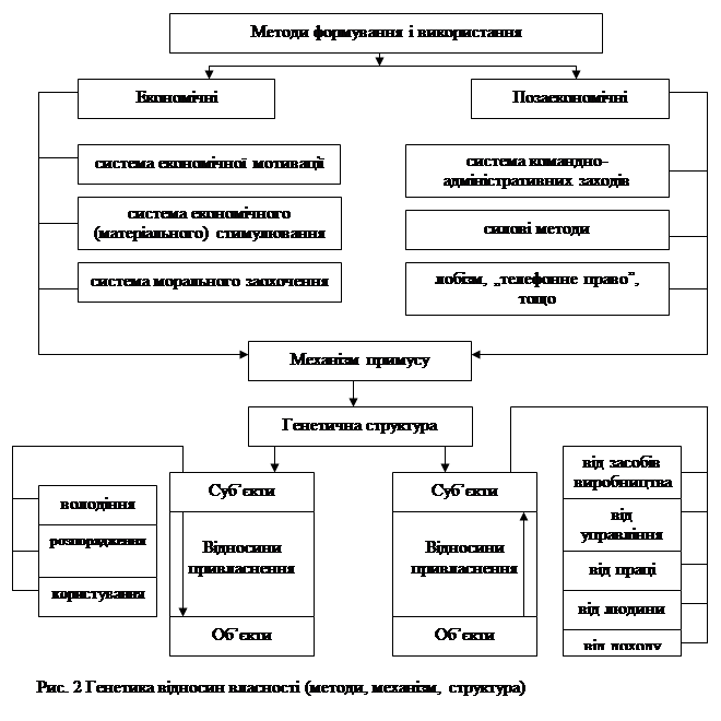 Обирати ті чи інші форми привласнення і відчуження економічних суб'єктів спонукають як об'єктивні, так і суб'єктивні обставини. Механізм примусу ґрунтується на сукупності економічних і позаекономічних методів (див. рис. 2). Переважання тих чи інших методів визначає політику "пряника" чи "батога" з боку власника до невласника.