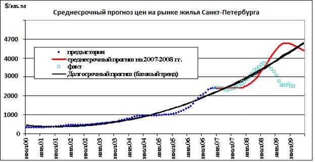 Для периода с сентября 2009 года было проведено исследование рынка жилья в Санкт-Петербурге, в результате которого был сделан вывод о том, что в долгосрочном периоде рынок переходит в фазу замедления темпов роста и начала спада, и разработан сценарный прогноз развития ситуации.