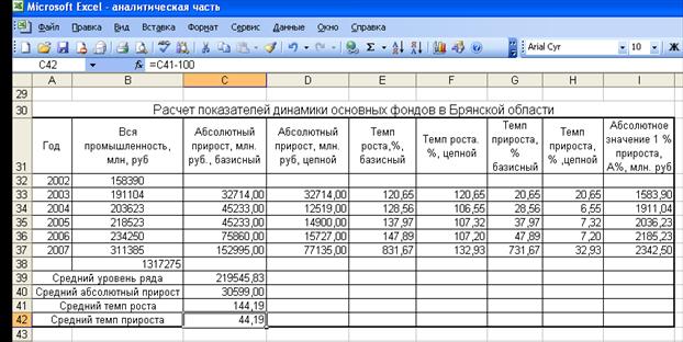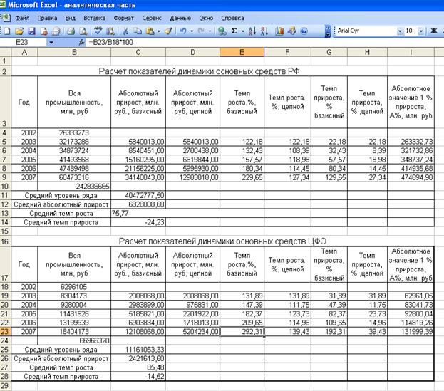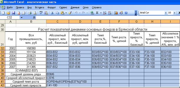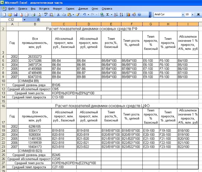 Аналитическая часть данной работы направлена на изучение динамики основных фондов России в целом, а также динамики основных фондов Центрального федерального округа и Брянской области за 6 лет с помощью цепных и базисных показателей.