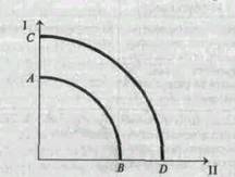 Увеличение объема ресурсов и повышение их качества за счет НТП приведет к смещению кривой производственных возможностей из положения АВ в положение CD . Если кривая производственных возможностей АВ (или CD ) рассчитана с учетом нормативного использования производственных мощностей, то ее можно назвать номинальной кривой. Реальная кривая будет находиться внутри кривой АВ (или CD ), так как на практике не бывает полного использования ресурсов экономического роста, что нетрудно видеть из анализа табл. 1
