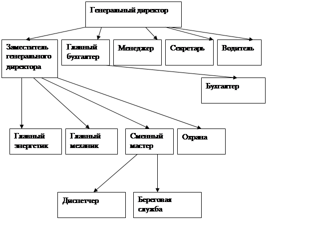 Как видно из приведенного выше рисунка, во главе производственной структуры предприятия стоит генеральный директор предприятия. В его непосредственном подчинении находятся заместитель генерального директора, главный бухгалтер, менеджер, секретарь и водитель. Заместителю генерального директора подчиняются главный энергетик, главный механик, сменный мастер и охрана организации.