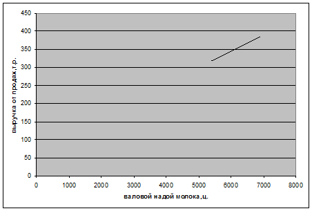Коэффициент корреляции = 0,67 показывает, что связь между выручкой от продаж и валовым надоем молока прямая (т.к. r>0) и по пределам средняя (т.к. 0,5<r<0.7).