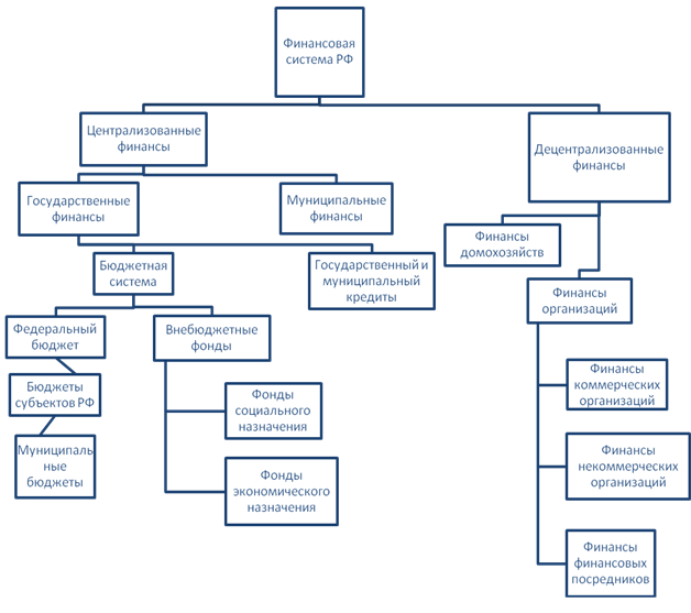 Финансовая система РФ подразделяется на сферу централизованных (публичных) и децентрализованных (финансы организаций и финансы домохозяйств) финансов.