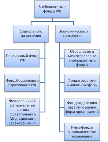 К внебюджетным фондам социального назначения относятся Пенсионный Фонд Российской Федерации, Фонд Социального Страхования Российской Федерации и Фонд Обязательного Медицинского Страхования.