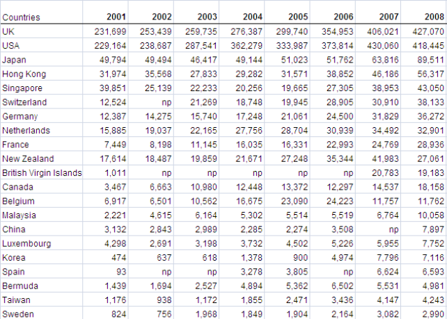 Источник : Australian Bureau of Statistics, 2009, Australia's foreign investment relationship with partner countries, Table 2: Inward Total Investment Stock by Source Countries