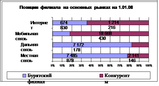 – Одной из наиболее стабильных и высокодоходных подотраслей в деятельности филиала остается «междугородная и международная телефонная связь» . Доля доходов МТС в 2007 году составляет 39% в общих доходах филиала, рост доходов от услуг МТС по сравнению с аналогичным периодом прошлого года при росте трафика на 31% составил 134%. Городская телефонная связь также продолжает оставаться наиболее стабильным и доходным видом связи. Удельный вес доходов ГТС в общей структуре доходов составляет 25%, рост к аналогичному периоду прошлого года составил 131%. Прирост основных телефонных аппаратов на сети ГТС составил 4890 шт., который обеспечен главным образом за счет прироста в г. Улан-Удэ (ГЦТ) – 4001 шт.