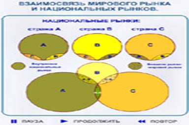 Мировой рынок - это совокупность взаимосвязанных и взаимодействующих друг с другом национальных рынков отдельных государств, участвующих в международном разделении труда, в международной торговле и других формах экономических отношений.