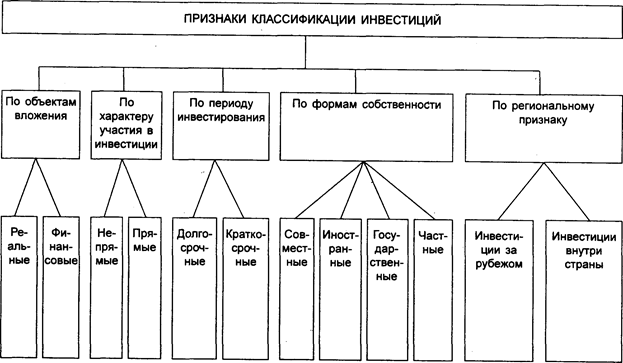 Инвестиции в объекты предпринимательской деятельности осуществляются в различных формах. В связи с этим для анализа и планирования инвестиций важной представляется классификация инвестиций по признакам, показанным на рис. 1.1.