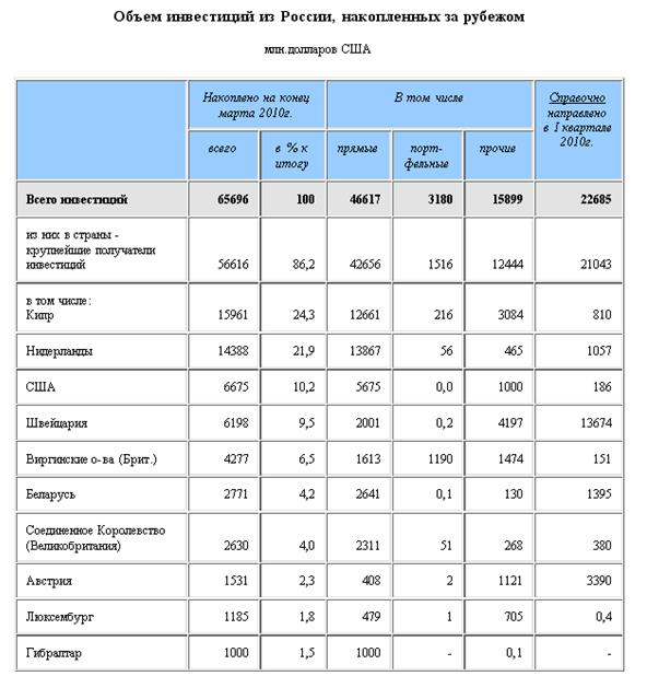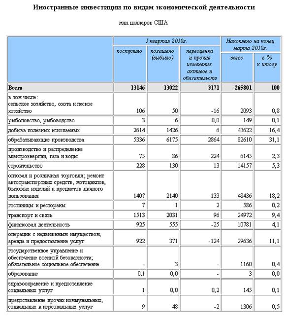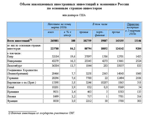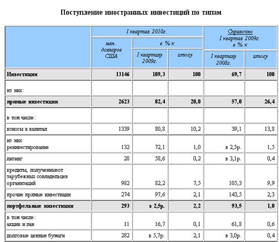 Становление новой экономической ситуации в России вызывает необходимость изменения механизма государственного регулирования инвестиционных процессов. Инвестиции в России за 2009 год в целом сократились на 16,2%, наибольшего масштаба сокращение инвестиций достигло в мае 2009 года – на 24,8% к соответствующему периоду прошлого года. На что Банк России снизил ставку рефинансирования в 10 раз, что способствовало положительному влиянию на инвестиционную активность. Стабильно финансировались инвестиции в основной капитал за счет бюджетных средств, инвестиции за счет федерального бюджета возросли на 21,9%. В январе 2010 года инвестиции в основной капитал составили 319,2 млрд рублей. Это означает сокращение на 8,7% по сравнению с 2009 годом. Снижение инвестиционной активности в январе этого года во многом было обеспечено сокращением объемов работ по виду деятельности «строительство» – на 10,6% относительно января 2009 года. Экономическая ситуация, сложившаяся в стране к началу 2010 года, обуславливает актуальность разработки стратегий преодоления низкой инвестиционной активности. Что касается иностранных инвестиций, в экономику России в I квартале 2010г. их поступило 13,1 млрд долл. Это на 9,3% больше, чем за тот же период 2009г. Впрочем, объем погашенных инвестиций, поступивших ранее в Россию из-за рубежа, в январе-марте с. г. составил те же 13 млрд долл., что на 7,9% больше показателя за I квартал 2010г. Накопленный иностранный капитал в экономике России (общий объем инвестиций, произведенных с начала вложения с учетом погашения и переоценки активов и обязательств) по состоянию на конец марта с. г. составил 265,8 млрд долл., увеличившись на 17,2% в годовом исчислении. Большую его часть составили инвестиции, осуществляемые на возвратной основе (53,8%). Прямые инвестиции составляют 38,7%, портфельные — 7,5%. Объем инвестиций из России, накопленных за рубежом, на конец марта с. г. составил 65,7 млрд долл. В I квартале этого года из России за рубеж направлено 22,7 млрд долл. иностранных инвестиций (+15,2%), тогда как объем погашенных инвестиций составил 22,1 млрд долл.(+36,8%).