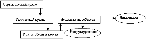 Кризисные ситуации, возникающие вследствие неравномерного развития народного хозяйства и его отдельных частей, колебания объемов производства и сбыта, появления значительных спадов производства, следует рассматривать не как стечение неблагоприятных ситуаций (хотя для отдельного предприятия это может быть и так), а как некую общую закономерность, свойственную рыночной экономике. Кризисные ситуации, для преодоления которых не было принято соответствующих превентивных мер, могут привести к чрезмерному разбалансированию экономического организма предприятия с соответствующей неспособностью продолжения финансового обеспечения своей деятельности, что квалифицируется как банкротство.