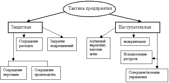 Наиболее эффективна наступательная тактика (см. рисунок 1.3), для которой характерно применение не столько оперативных, сколько стратегических мероприятий (см. рисунок 1.4). В этом случае наряду с экономными, ресурсосберегающими мероприятиями проводится активный маркетинг, изучение и завоевание новых рынков сбыта на совершенствование системы управления, производства за счет их модернизации, внедрения перспективных технологий.