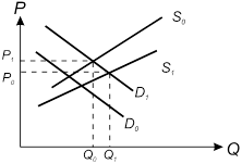 Повышение спроса (сдвиг кривой D 0 в положение D 1 ) вызывает рост цены с P 0 до P 1 . Возросшая цена — это сигнал для производителя о выгодности увеличения объемов выпуска. Расширение производства (сдвиг кривой S 0 в положение S 1 ) ведет к снижению равновесной цены и увеличению равновесного объема Q 1 .