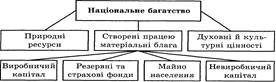 Про результати розширеного відтворення економічний потенціал певної країни найповніше уявлення дає національне багатство. Національне багатство — це сукупність створених та нагромаджених у країні працею всього суспільства матеріальних благ, розвіданих природних ресурсів, досягнутого рівня освіти людей, їхнього досвіду, майстерності, творчих здібностей, які призначені для розширеного відтворення з метою підвищення добробуту нації. Найважливішими складовими національного багатства є (рис..1): — створений і накопичений країною виробничий (основний і оборотний) капітал: основний капітал — це засоби праці (будівлі, споруди, машини, обладнання тощо); оборотний — предмети праці (матеріали, паливо, сировина та ін.); — невиробничий капітал (житлові будинки, культурно-освітні та спортивні заклади тощо); — майно населення — будинки, автомобілі тощо; — різноманітні запаси — готова продукція, страхові й резервні запаси; — залучені в процес виробництва природні ресурси — земля, ліси, розвідані корисні копалини; — нематеріальні складові — накопичений досвід людей, їхні здібності, культурні цінності тощо.