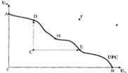 Проаналізуємо детальніше стан суб'єктів в різних точках кривої. Точка Fпоза межами UPC є недосяжною для обох індивідів внаслідок обмеженості ресурсів споживання. У точці А всі блага суспільства зосереджені у суб'єкта М, корисність якого досягає максимуму за даних наявних ресурсів, а учасник N не має жодного блага, його корисність є нульовою. У точці В ситуація протилежна - суб'єкт N володіє всіма ресурсами споживання, а ресурси споживання і корисність суб'єкта М дорівнюють нулю. Обидві точки А і В є ефективними за Парето, тому що в обох точках покращення для одного індивіда неможливі без погіршення стану іншого. Рух з точки А до точки В по кривій можливих корисностей надає безліч компромісних комбінацій, за кожної з яких все більша кількість благ перерозподіляється від суб'єкта М до N, при цьому стан М постійно погіршується, aN - покращується.Точка С не належить UPС і не є Парето - оптимальною, тому що, рухаючись до точки D, розташованої на межі можливих корисностей, можна значно поліпшити стан М без змін стану N, а рухаючись до точки Е можна поліпшити стан N без змін для стану М. Будь-яка точка межі можливих корисностей між Dі Е відповідатиме покращенню положення обох індивідів порівняно з точкою С. Отже, в точці С ресурси розподілені неоптимально, має місце недовикористання або розтрата ресурсів. Жодна точка, яка знаходиться під межею можливих корисностей, не буде ефективною за Парето.