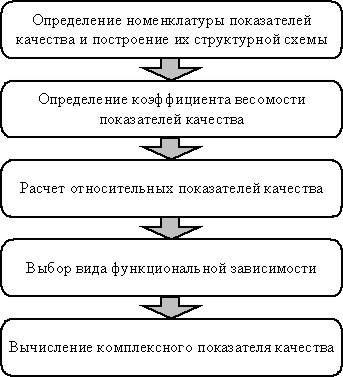 При применении комплексного метода применяют комплексный показатель качества, который определяется путем сведения воедино отдельных показателей с помощью коэффициентов весомости каждого показателя. При этом может быть использована функциональная зависимость:
