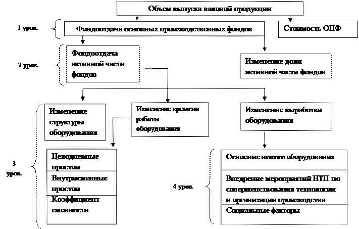 Для расчета влияния факторов третьего порядка на уровень фондоотдачи необходимо знать, как изменился объем производства продукции в связи с заменой оборудования, его модернизацией, либо изменением условий организации труда. С этой целью надо сравнить выпуск продукции на новом и старом оборудовании за период времени после его замены и полученный результат разделить на фактическую среднегодовую стоимость технологического оборудования: