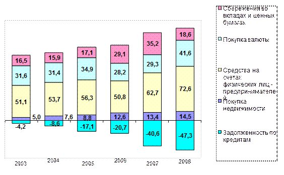 В структуре расходов населения за последние годы произошли определенные изменения. Так, расходы на потребительские цели в 2008 году, по сравнению с 2003 годом, увеличились на 8,3 п.п., расходы на оплату обязательных платежей и добровольных взносов на 3,8 п.п. Отмечается снижение доли сбережений на 12,9 п.п. На рисунке 9 продемонстрировано использование денежных доходов населения (в процентах от общего объема денежных доходов).