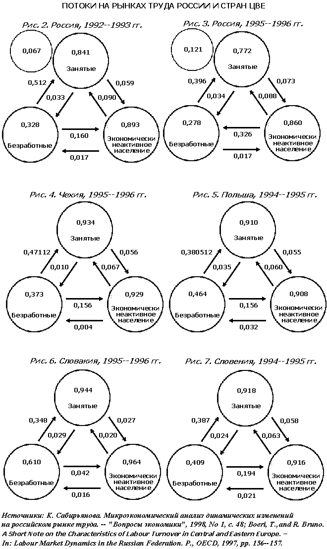 Источники: Boeri, T., Burda, M.C., and J. Kollo. Mediating the Transition: Labour Markets in Central and Eastern Europe. N.Y.: Centre for Economic Policy Research, 1998, 18; Р. Капелюшников. Движение рабочей силы и рабочих мест в российской промышленности. — "Вопросы экономики", 1998, N 2, с. 104.