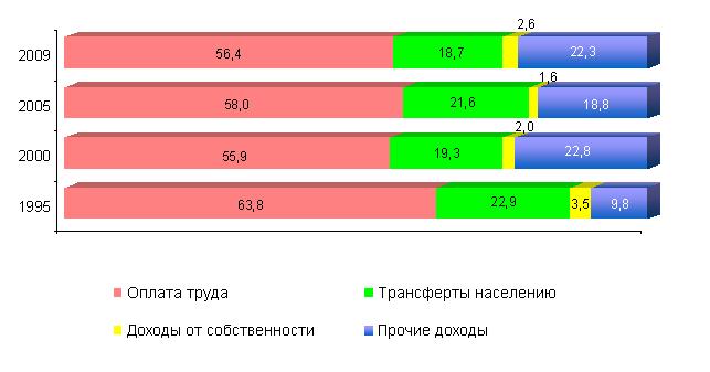 главными составляющими денежных доходов населения являются оплата труда, доходы от предпринимательской деятельности и собственности, а также социальные трансферты.[13]