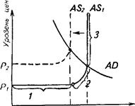 Увеличение денежной массы по указанным выше причинам в течение короткого промежутка времени сдвигает кривую совокупного спроса вправо (ADi -> AD2), и если экономика находится на промежуточном (2) или классическом (3) отрезках кривой совокупного предложения, то это ведет к росту цен, что представляет