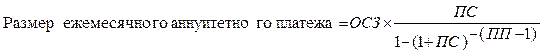 | ОСЗ – остаток основного долга на расчетную дату; ПС – месячная процентная ставка, равная 1/12 от годовой процентной ставки, установленной на сумму предоставленных денежных средств (в процентах годовых); ПП – количество Процентных периодов, оставшихся до окончательного возврата денежных средств. |
