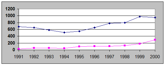 Однако под воздействием непримиримых противоречий жизнь преподносит один парадокс за другим. В частности, чем больше проявляется заботы об улучшении условий привлечения инвестиций, тем острее становится инвестиционная проблема. На откуп иностранному капиталу отданы практически все “командные высоты“ экономики, дело дошло даже до либерализации земельного оборота, а ожидаемого притока инвестиций как не было, так и нет. Более того, компрадорская система продолжает ускорять их отток из страны, что явственно обнаруживается по данным анализа платежных балансов за 1994-2000 гг.: пик вывоза капитала в товарной форме приходится на вторую половину прошлого года.