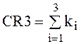 2. Индекс концентрации ( concentration ratio ) CR . Характеризует долю нескольких (трех, пяти, десяти и т.п.) крупнейших фирм в общем объеме рынка в процентах. Определяется как сумма рыночных долей крупнейших фирм, действующих на рынке.Например, для трех крупнейших фирм