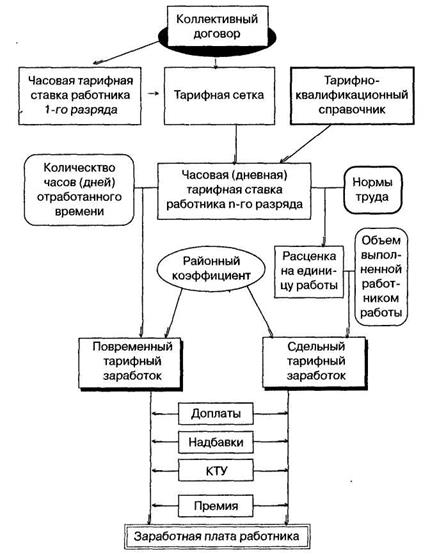 Порядок исчисления заработной платы работникам всех категорий регламентируют различные формы и системы заработной платы. Формы и системы заработной платы - это способ установления зависимости между количеством и качеством труда, то есть между мерой труда и его оплатой. Для этого используются различные показатели, отражающие результаты труда и фактически отработанное время. Иными словами, форма оплаты труда устанавливает, как оценивается труда при его оплате: по конкретной продукции, по затраченному времени или по индивидуальным или коллективным результатам деятельности. От того, как форма труда используется на предприятии, зависит структура заработной платы: преобладает ли в ней условно-постоянная часть (тариф, оклад) или переменная (сдельный приработок, премия). Соответственно разным будет и влияние материального поощрения на показатели деятельности отдельного работника или коллектива бригады, участка, цеха.