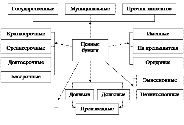 Если принять в расчет цели выпуска ценных бумаг, характер сделок, лежащих в основе их выпуска, способы предоставления средств и выплаты доходов, то ценные бумаги можно подразделить на: