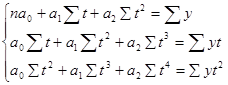 Система нормальных уравнений для расчета параметров параболы второй степени составит: