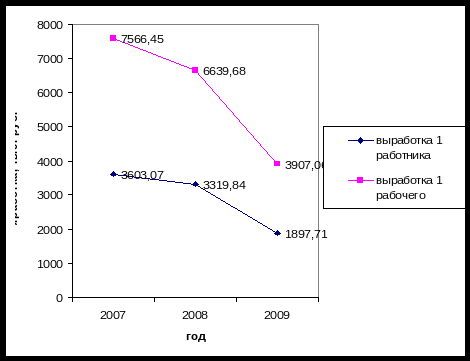 Анализ производительности труда показывает, что среднегодовая выработка одного работника, занятого в основном производстве, уменьшилась в 2008 г. на 283,23 тыс. руб. и в 2009 г. на 1705,4 тыс. руб. Эти изменения связаны с уменьшение объемов работ за анализируемый период времени.