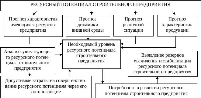 Ресурсный потенциал строительного предприятия – это совокупность накопленных ресурсов хозяйствующего субъекта, характеризующих возможности системы по осуществлению целенаправленной деятельности с учетом влияния факторов внутренней и внешней среды.