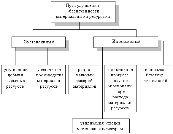 Удовлетворение потребности предприятия в материальных ресурсах может обеспечиваться двумя путями: экстенсивным и интенсивным (рисунок 4). Экстенсивный путь предполагает увеличение добычи и производства материальных ресурсов и связан с дополнительными затратами. Кроме того, рост объема производства при существующих технологических системах привел к тому, что темпы истощения природных ресурсов и уровень загрязнения окружающей среды вышли за допустимые пределы. Поэтому рост потребности предприятия в материальных ресурсах должен осуществляться за счет более экономного их использования в процессе производства продукции или интенсивным путем.