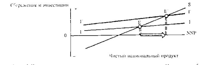 Кроме центрального банка, правительство имеет другие пути воздействия на расходы. Как часть своей фискальной политики оно может повысить свои расходы: строить полезные общественные дороги и школы, нанимать больше гражданских чиновников, повышать расходы на оборону, делать тысячу и одну полезных или глупых вещей с целью расширения совокупных расходов. Это может быть показано на графике сбережения и инвестиций, подобном рис. 1.