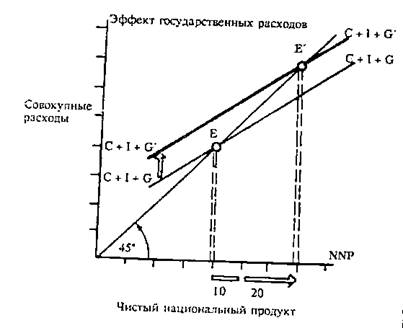 Рис. 2. Рост государственных расходов сдвигает С +I + G вверх до С + I +G'. Точка Е' отмечает полученный в результате этого более высокий доход. Понижение налогов оказывает аналогичное воздействие на доход. Низкие налоговые сборы оставляют вам больше чистого дохода из NNР и, следовательно, сдвигают вверх кривую потребления. В результате новой кривой С' + I + G имеет место переход от Е к Е'. (1 долл. сокращения налога оказывает несколько меньший эффект, чем доллар роста G. Почему? Потому что некоторая часть того дополнительного дохода, который получен в силу сокращения налога, сберегается и не используется для сдвига вверх кривой СС. Если предельная склонность к потреблению (МРС) равна 2/3, то сокращение налогов на 10 единиц сдвинет кривую СС вверх на 2/3 * 10 = 6 2/3 )