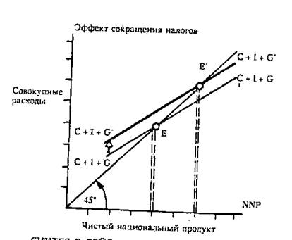 Аналогичный график может показать другую сторону фискальной политики — изменение уровня взимаемых налогов. Чтобы повысить чистый национальный продукт, фискальные власти снижают налоги: это дает населению дополнительный доход на потребление, то это значит, что оно будет больше потреблять.