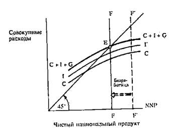 Что произойдет с кривой I в результате этого? Она сместится вверх. В то же самое время пусть правительство уменьшит тяжесть налогов,характерную для периода полной занятости. Это увеличит чистые доходы населения, увеличитих расходы на потребление и, следовательно, сдвинет вверх компонент С графика С+I+G. (Возможно, кривая I сдвинется вверх еще больше.) Не увеличивая прямо правительственные расходы, мы все же можем передвинуть всю кривую С+I+G достаточно далеко вверх, пока новая кривая С'+I'+G' не пересечет вспомогательную линию 45° на новом уровне полной занятости в точке Е'. Или же программы общественных работ или другие средства расширения О могут применяться для смещения кривой С+I+G до необходимого уровня, если будет решено, что это нужнее, чем увеличение С и I.