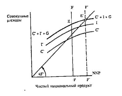Рис.3б.Полная занятость восстановлена. В результате кредитно-денежной политики, направленной на увеличение количества денег, увеличится I. Аналогичная фискальной политика снизит налоги, повысит чистый доход и сдвинет вверх кривую потребления. Равновесие полной занятости восстанавливается в точке Е', где кривая С' + Г + G' переместилась вверх и достигла нужных величин.